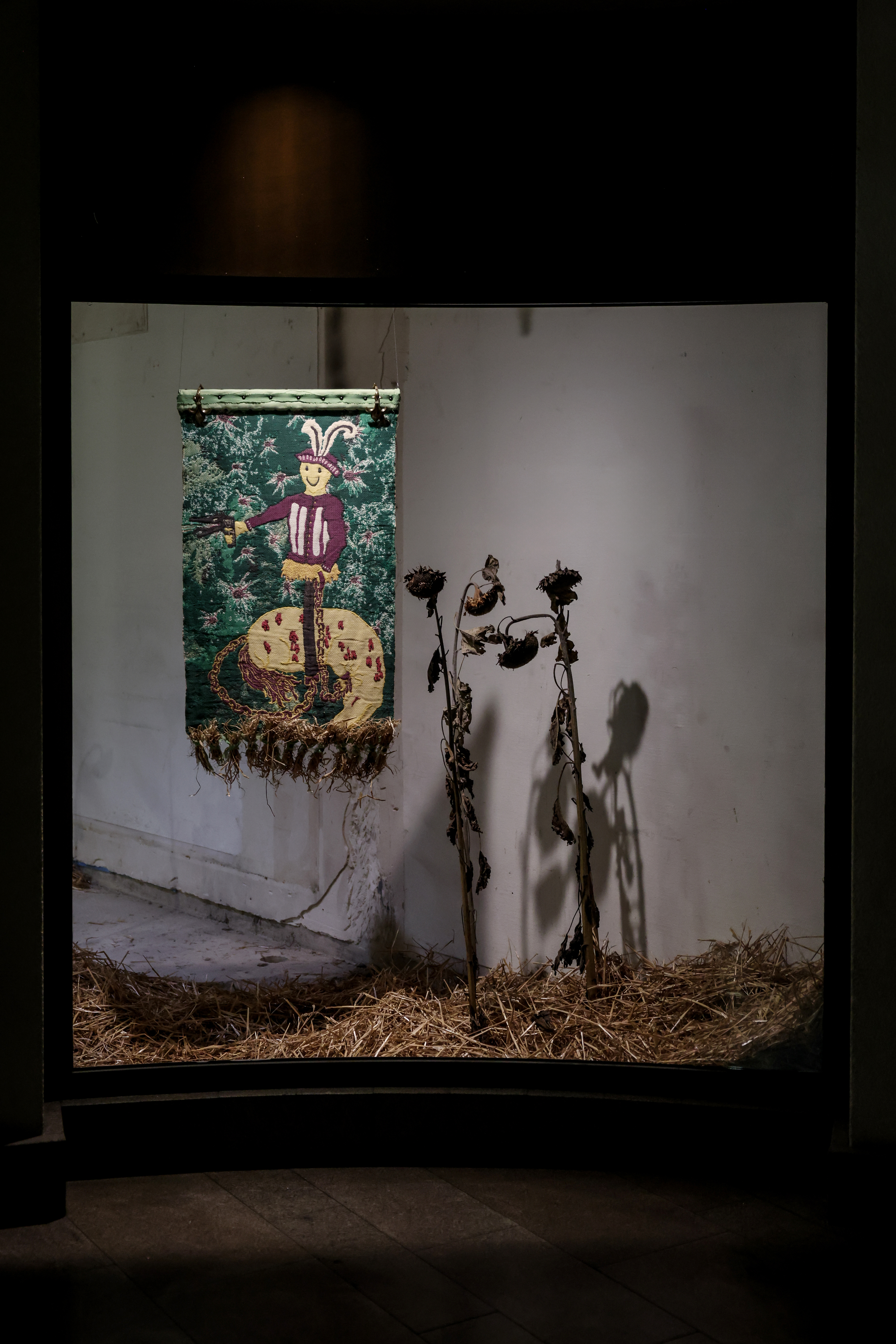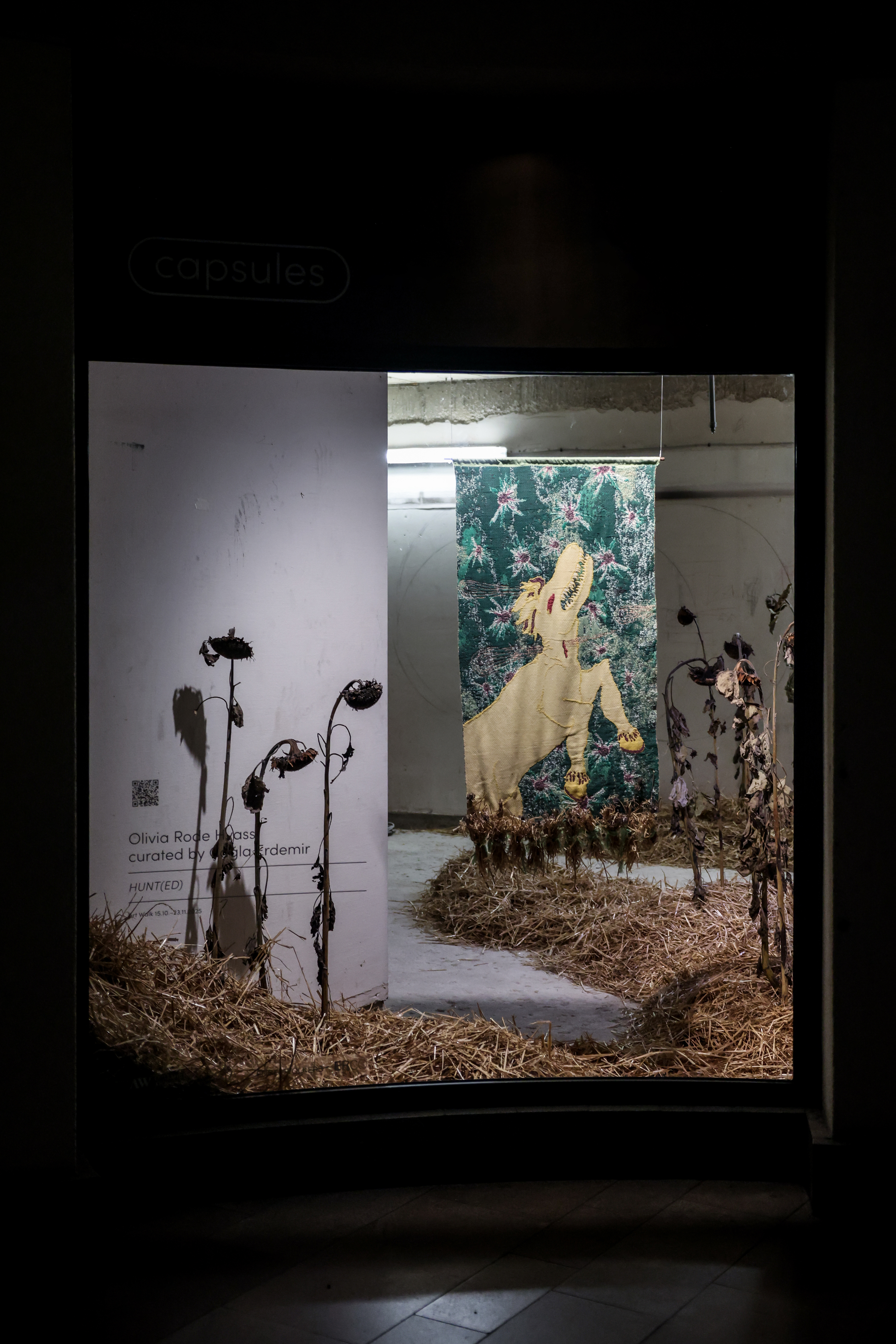 Central to the installation is the figure of the horse – once a unicorn. Inspired by the 16th-century tapestry cycle La Chasse à la licorne, in which a mythical creature is hunted, subdued, and caged, Hvass revisits the image of the unicorn not as a romantic fantasy, but as a symbol of categorisation and control. Historically, the unicorn has stood for the magical, the Other, the untameable – and has been weaponised to represent desire subdued, difference regulated. While the original cycle celebrates the unicorn’s capture, Hvass interrogates the narratives of domination embedded in such imagery. In her reinterpretation, the lush hunting grounds lie desolate, covered in brittle hay; the once-mythic unicorn has shed its horn and returned as a grounded, hornless horse.